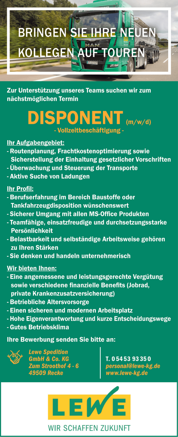 Der Name LEWE steht für Service, Qualität, Innovation und Kompetenz – und das in allen Geschäftsfeldern: im Bauunternehmen, in der Spedition, der Baustoffgewinnung und im Wohnungsbau. Wir arbeiten dienstleistungsorientiert und stets eng mit unseren Kunden zusammen. So finden wir für jedes Bauprojekt, jeden Transport- oder Lieferauftrag und für jeden Kundenwunsch eine individuelle Lösung, die auf einer fairen Preisgestaltung basiert.